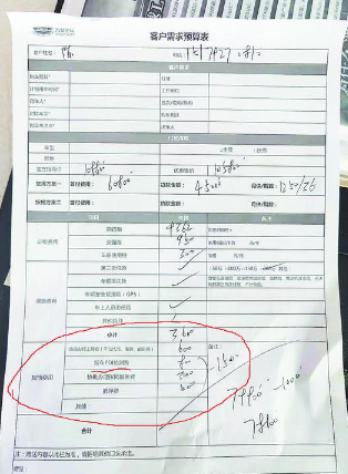 在该店销售顾问的预算单据上,罗列有包括交强险、全车抢盗险等在内的多款险种,共计需收取3800元保险费用,并称第一年保险必须在4S店内购买。