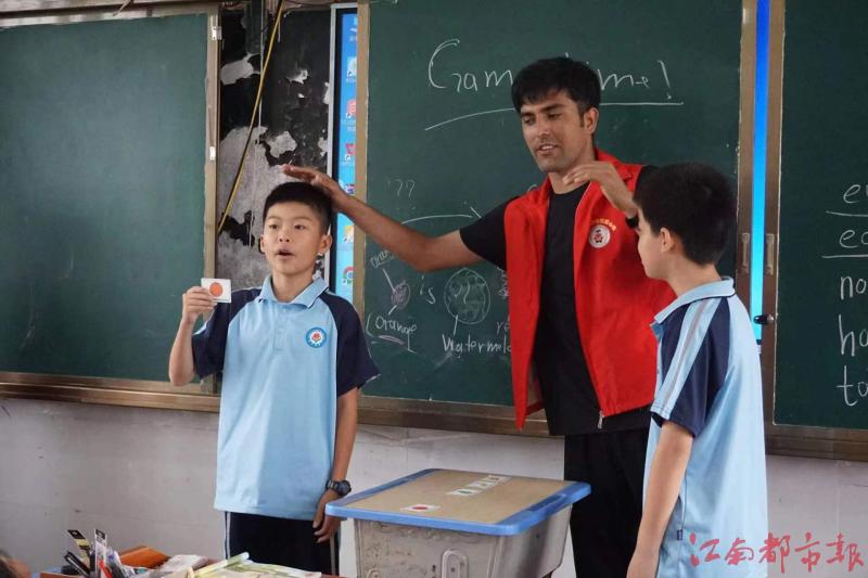 实践团队走进石山乡中心小学,给石山乡中心小学捐赠了《井冈山的红色传说》以及红色传说连环画、漫画等红色书籍,为中心小学的学生们送去了温暖和爱。团队成员们通过讲、唱结合的方式带着小学生们走进红色故事情节中,领着小学生们学唱革命歌曲,讲述红色传说,让他们深切体会红色革命精神。团队成员们讲述《小英雄雨来》这个红色故事,教孩子们学唱革命歌曲《歌唱祖国》《映山红》,并通过ppt、视频来提高孩子们的兴趣,让孩子们在故事的讲述中,对革命时期革命先烈的坚定意志和忠诚信念有了更深刻的认识。为了加强小学生们学习英语的兴趣,学院特邀请了国际学院的两位同学来参加实践活动。他们分别来自巴基斯坦和卢旺达,两名留学生化身“洋老师”,给小学生们开展了风趣幽默的英语小课堂。两名留学生给小朋友们传授了有关身体部位和有关水果的英语单词。每教一个单词,团队成员们就会请小朋友们触摸自己身体对应的部位。课堂教学中,实践团队成员通过小游戏,使小学生们在学习中体会到了学习英语单词的乐趣。