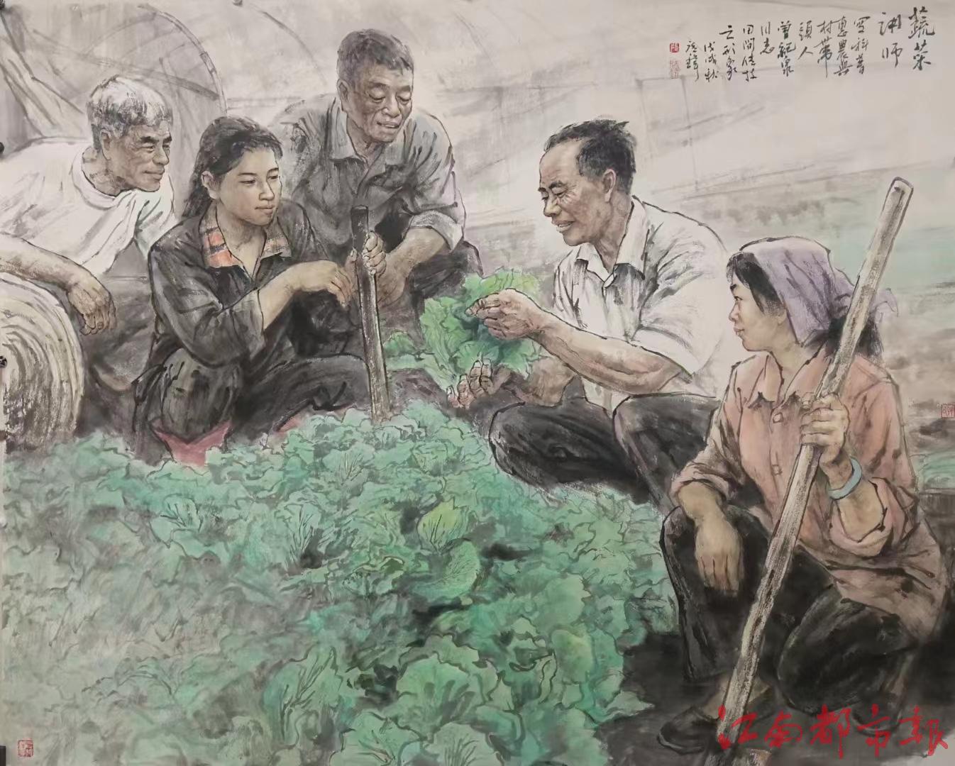 此时画面中的老表有的在扶贫,有的在田间劳动,有的进城创业,手法处理上也不单单是肖像,整张画场面更大,人群更多。如作品《蔬菜讲师》根据真人真事绘画,一位劳动模范老表致富以后,把自己的种菜技术传授给其他村民。张启锋展现的是他被大家团团围住的热烈场面。
