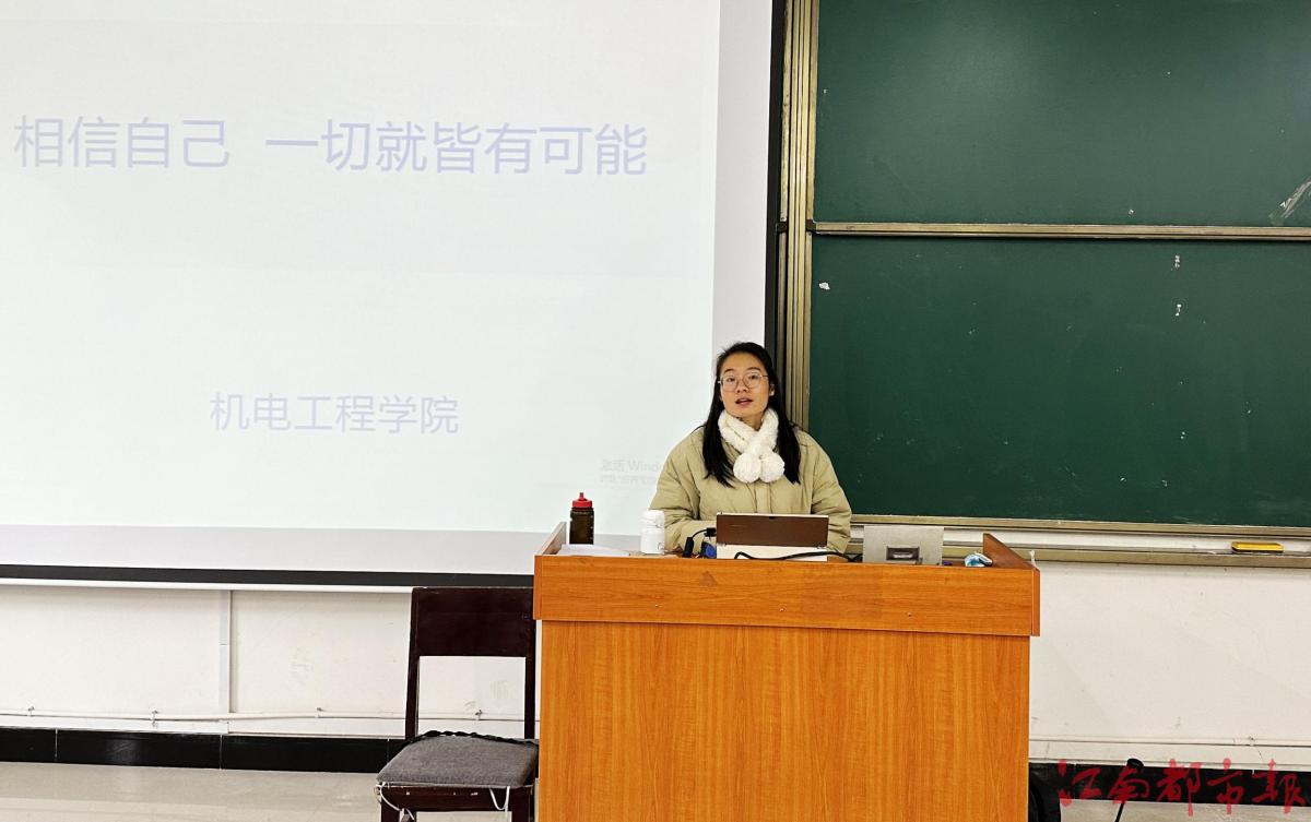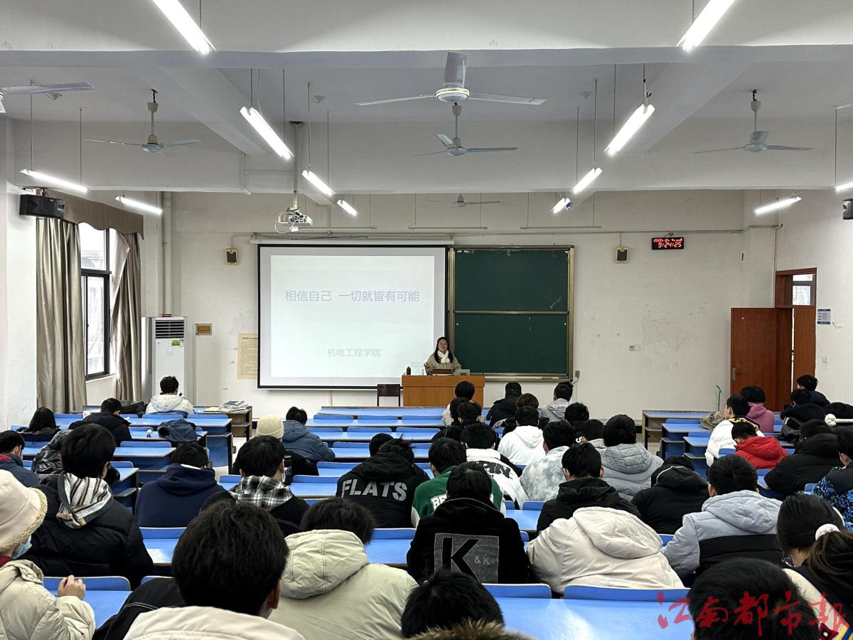 江南都市报讯 全媒体记者许南平摄影报道:随着考研时间越来越近,众多学子已进入考研冲刺阶段,部分考研学生的心理压力也越来越大。为缓解考研学生的心理压力,鼓励考研同学积极应对考试,增强备战信心,疏导学生在冲刺阶段的紧张情绪,12月5日上午,井冈山大学机电工程学院心理导师黄秀兰老师考研学生进行了“相信自己,一切皆有可能”主题考研心理辅导讲座。