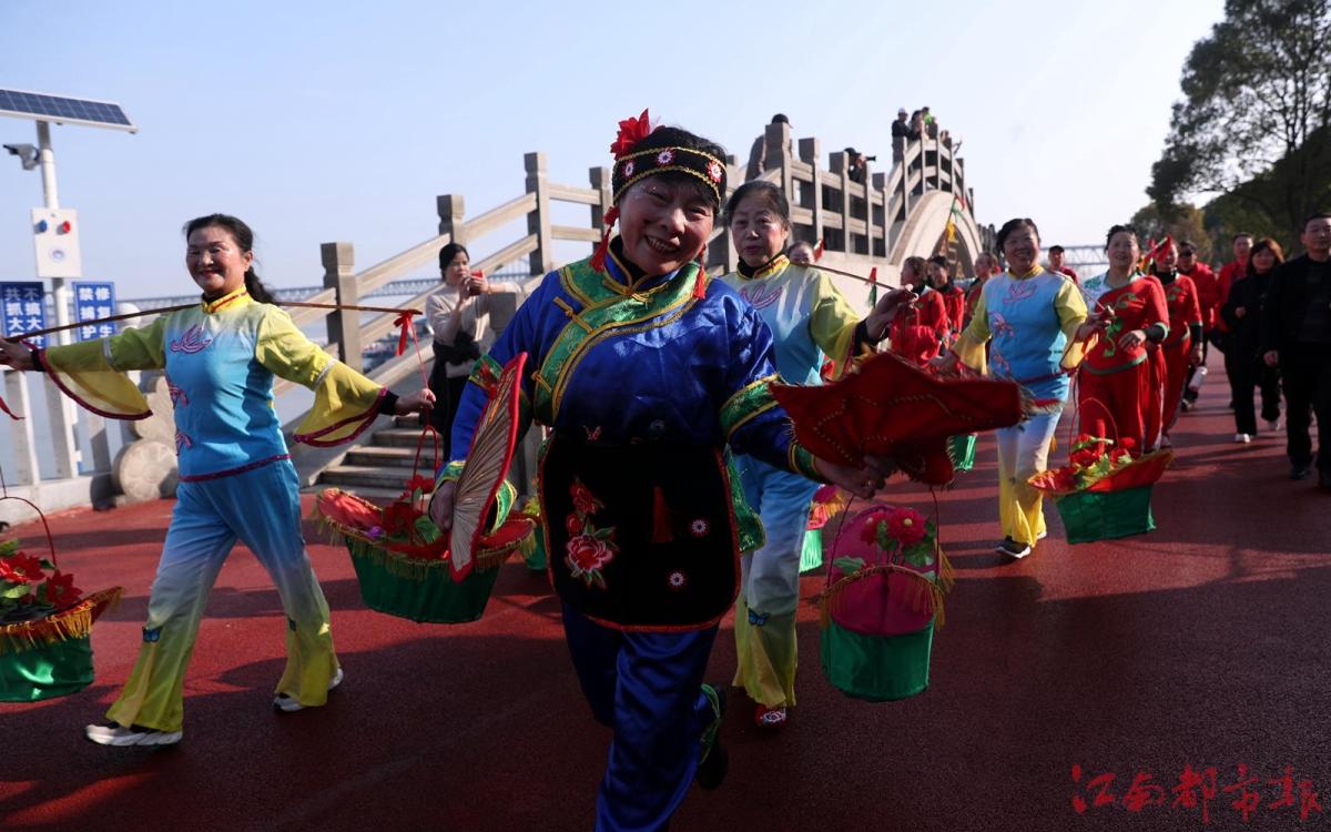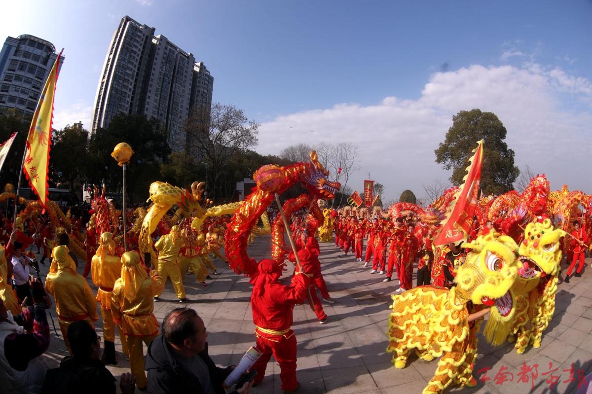江南都市报讯 全媒体记者许南平摄影报道:2月14日,农历大年初五。九江市龙狮闹春,灯彩踩街,热闹非凡。上午9时,来自各县区的20多支龙狮队和灯彩队从浔阳区白水湖公园出发沿长江岸线堤坝至镇水牛广场,从大中路茶市米市广场出发沿大中路至西段西入口一带进行踩街。演出队各具魅力,喜庆的舞龙气势磅礴,威武的雄狮前后跳跃。灯彩表演现场,队员们身着喜庆的服装,迈着灵巧或铿锵的步伐,和着喧天的锣鼓声。舞龙、舞狮、扭秧歌……尽情抒发着内心的喜悦。精彩的表演让数万市民拍手叫好,浓郁的年味儿四处洋溢。记者在九江市镇水牛广场看到,数千人在这里集中表演龙狮灯彩、合唱《龙的传人》等节目。