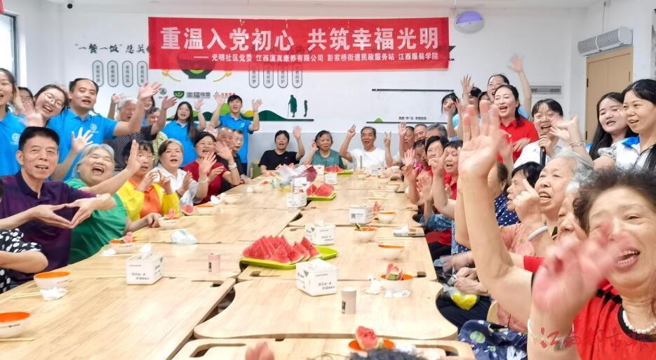 江南都市报讯 全媒体记者段萍、实习生喻言摄影报道:7月1日的清晨,南昌大雨滂沱,但是光明社区的幸福食堂里却热火朝天,几十位白发老党员们兴致昂扬地相聚在一起,与来自江西服装学院红色之旅学习者实践队的师生们,共同以一堂党课、一碗长寿面、一句祝福、一枚纪念章、一段入党誓词、一场文艺演出、一次志愿服务的“七个一”形式,欢度“七一”,庆祝党的生日。