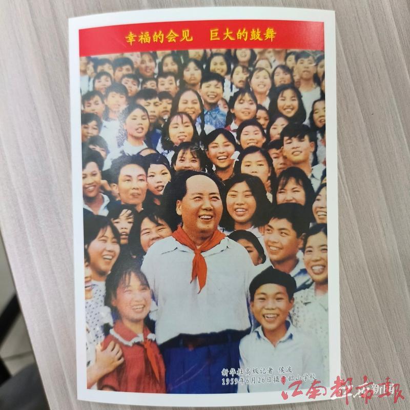 ▲蒋含宇赠送给记者的明信片(图中照片由新华社高级记者侯波1959年6月26日摄于韶山学校,照片下方右为蒋含宇,左为彭淑清。)