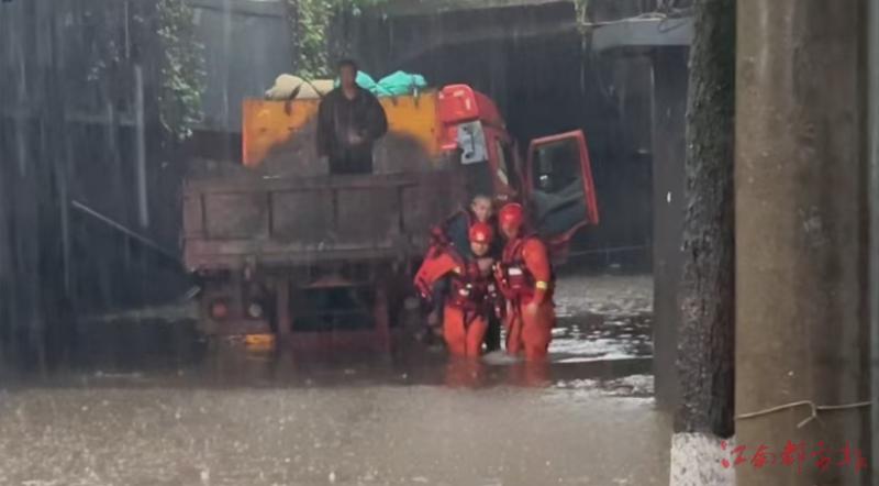 消防救援人员赶到现场看到,一辆货车和一辆轿车停在桥洞内,桥洞积水深约1米,且水位不断攀升,小车因为涉水过深,司机推不开车门,无法自行脱困,货车司机则已自行爬上车厢,等待救援。
