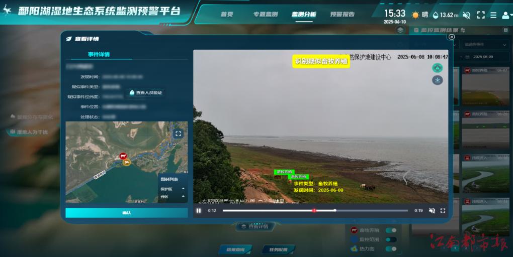 为实时监测破坏湿地的违法犯罪行为,我省还启用了鄱阳湖湿地生态系统监测预警平台。“每年的鄱阳湖枯水期,容易出现如越野车进入草洲、放牧垂钓等违法违规事件,这些行为突发性强、持续时间较短,依靠人工巡护的方式,存在难监管、难执法的问题。现在,我们通过这个平台能够对破坏湿地和候鸟生存的违法犯罪行为进行实时监测预警,发现此类行为后可以第一时间通知有关管理单位进行联动处置,大大提高了保护工作效率。”省自然保护地建设中心副主任李朝阳说,该平台自2024年12月上线运行以来,累计已监测并处置湖区人为干扰事件264起。在今年5月开展的“铁拳净湖2025A”行动中,该平台承担线上巡查任务,充分发挥“智能监测+快速响应”功能,发现违法违规事件5起,为有效打击破坏湿地资源等违法违规行为提供支撑保障。