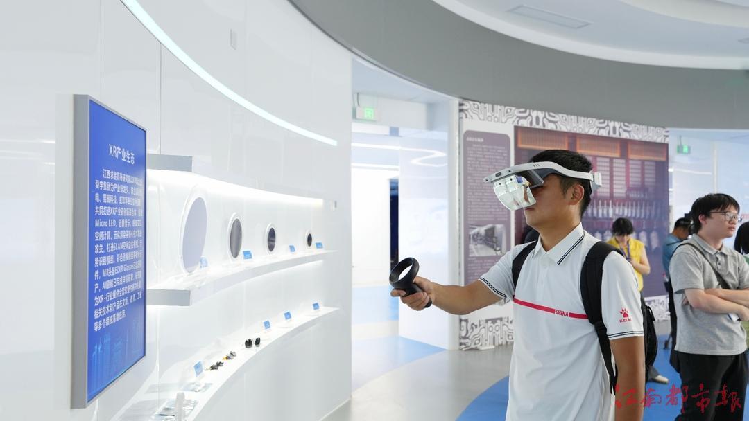 从宏观的城市发展脉络走向微观的产业创新引擎,参观视角的切换也让采访团对此次媒体行的探索更深入一层。带着对南昌城市发展脉络的深刻印象,采访团于当日下午3时许来到此行第四站——位于南昌市红谷滩区慧谷产业园的江西求是高等研究院。这座由浙江大学与南昌市人民政府联合共建的新型研发机构,以“光电+AI”为核心方向,围绕先进光学显示、智能光子芯片、自主可信导航以及智能图形图像技术及应用等科学及产业应用前沿方向,软硬协同、光电融合,加速产学研成果落地应用,成为推动南昌市VR产业发展的重要科技引擎。