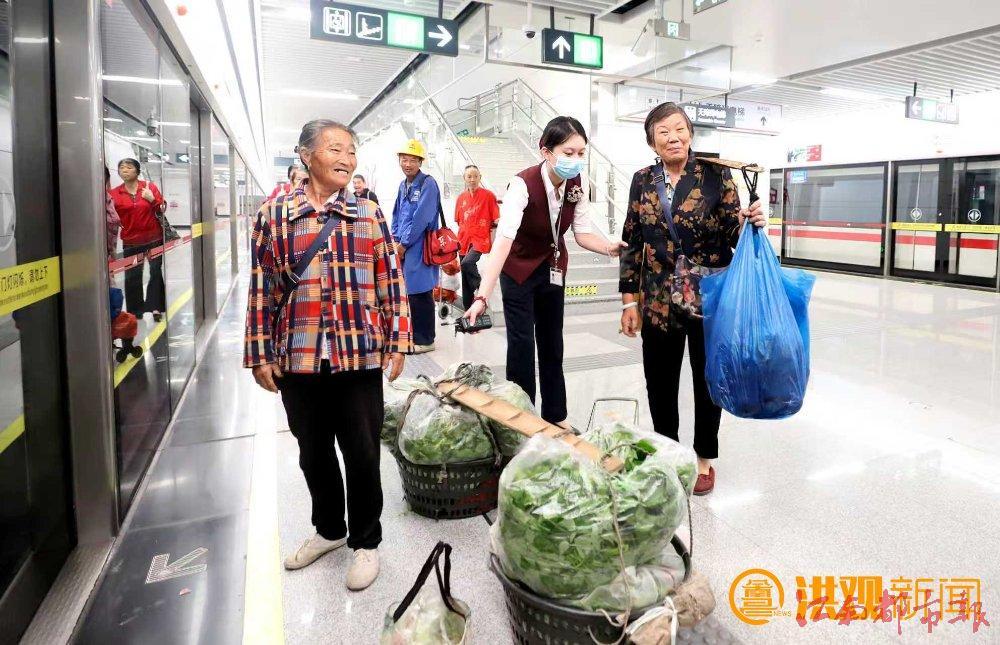 凌晨5时许,南昌地铁1号线麻丘站外,71岁的秦瑞兰肩挑扁担,两头的麻袋里装满了蔬菜,正在等地铁的门打开。刚走到安检处,工作人员便主动迎上前帮菜农拿麻袋过安检并引导菜农有序上车。“都是自己家种的菜,一大早就起来摘,特别新鲜。”在地铁上,秦瑞兰和身旁的菜农聊起来。秦瑞兰告诉记者,“以前菜运进城里卖,得转公交再搭地铁,现在乘坐地铁直达,太方便了。”