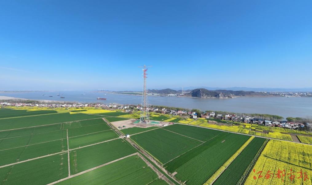 图为省送变电公司施工人员组立九江棉船风电项目外送线路跨长江高塔