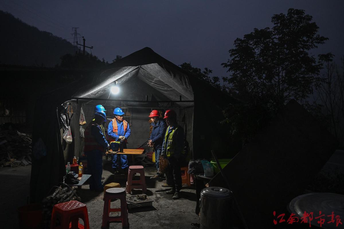▲11月20日,天刚微亮,工人们开完简短的班前会,准备前往大山深处的施工点。