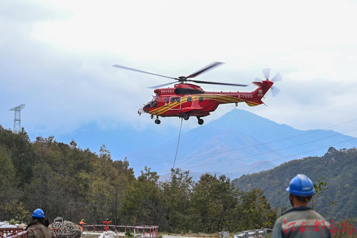 11月18日,记者在茂县土门镇境内看到,一架直升机在空中来回穿梭,将铁塔建材一趟趟地运往施工点。“园区内植被茂密,车辆运输和索道架设都可能对植被造成破坏,直升机运输能最大限度减少施工对生态环境的影响。”该标段项目经理王玥说。