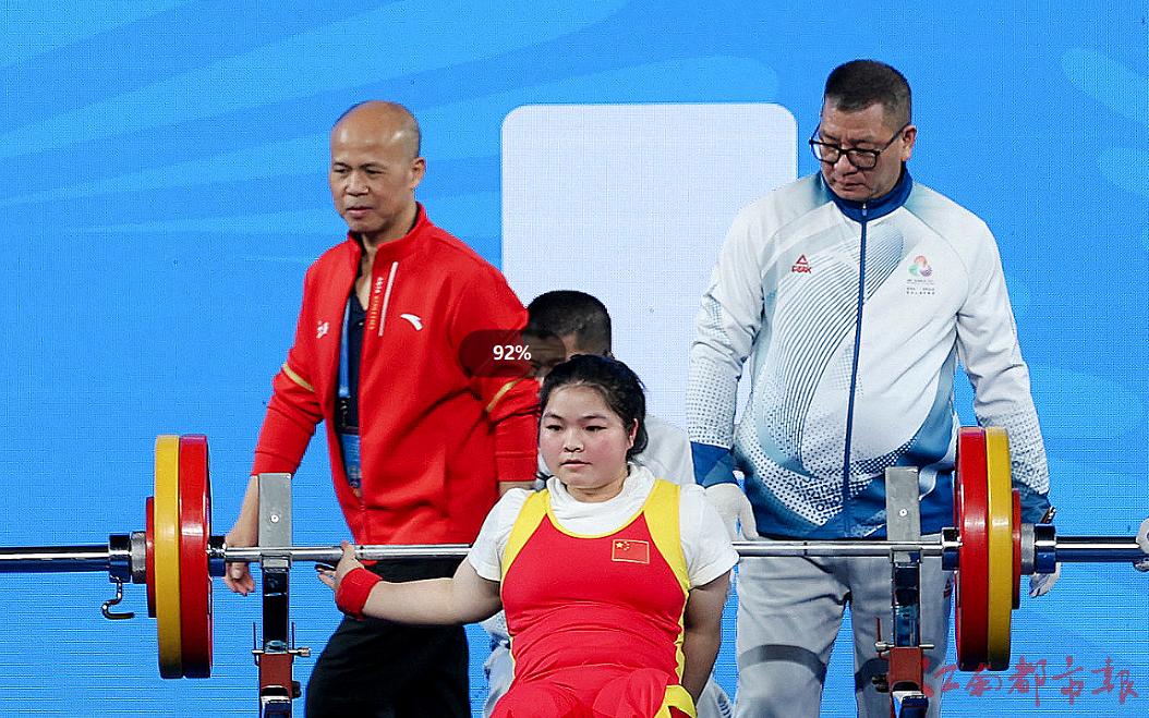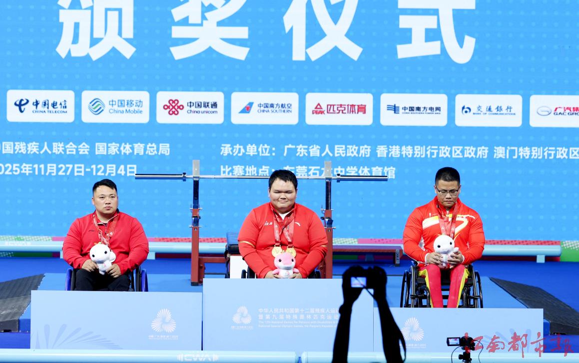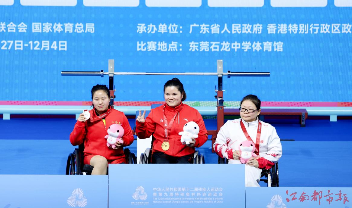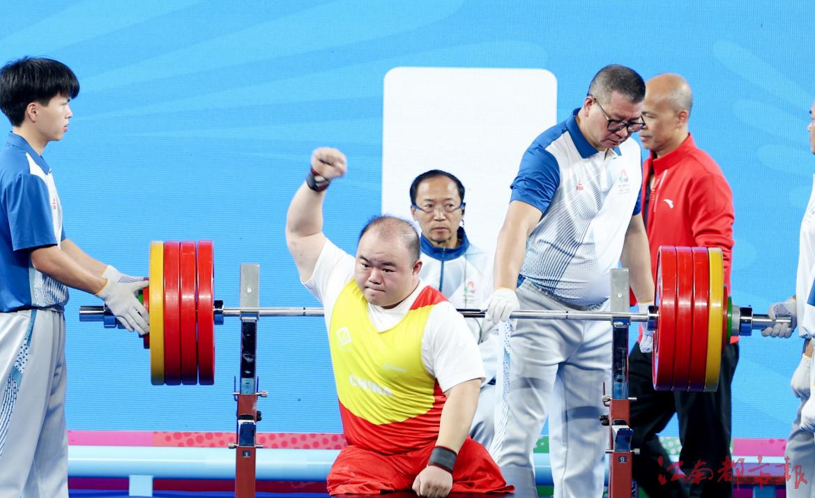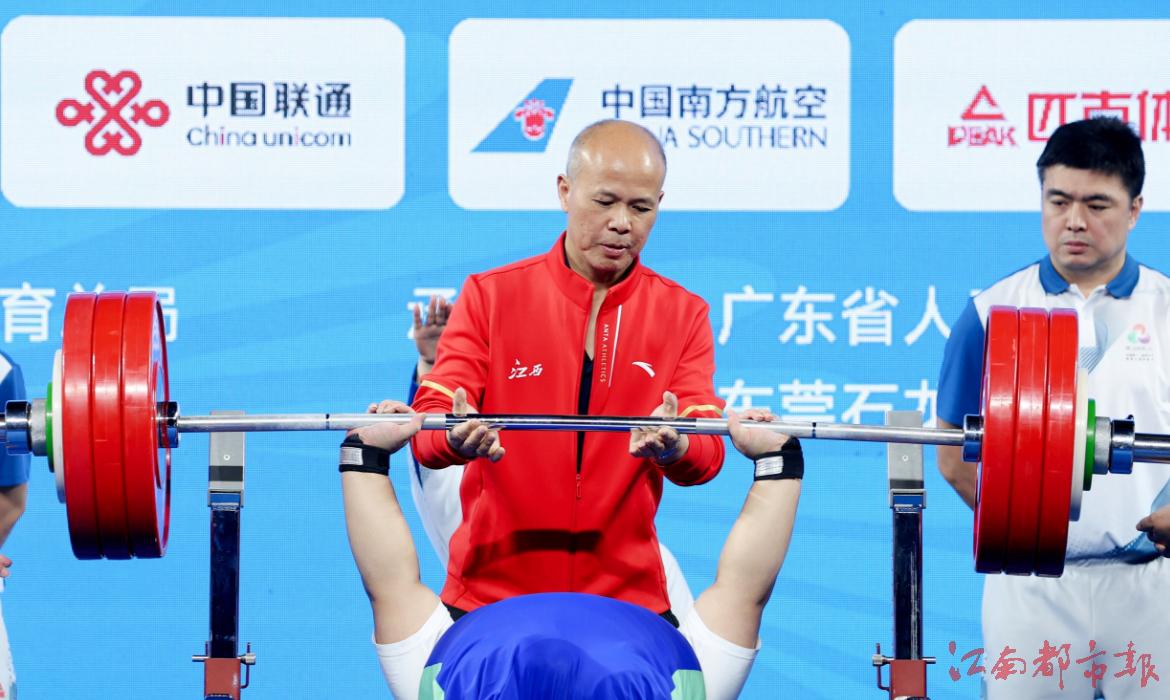江南都市报讯 全媒体特派记者许南平摄影报道:12月8日,全国第十二届残运会暨第九届特奥会在广州开幕,在率先进行的残运会跆拳道、赛艇和举重项目的比赛中,江西代表团全体运动员秉持 “勇气、决心、超越”的残特奥会运动精神,在赛场上全力以赴、奋勇拼搏,已收获竞技项目9金5银7铜的好成绩。运动员朱文军在举重比赛中,凭借161公斤的个人最佳重量与436公斤的总重量,斩获女子86公斤以上级2枚金牌,并以 161 公斤的优异成绩,成功打破该级别160.5公斤全国纪录!9日开始,各项赛事将全面开打,期待我省健儿捷报频传。