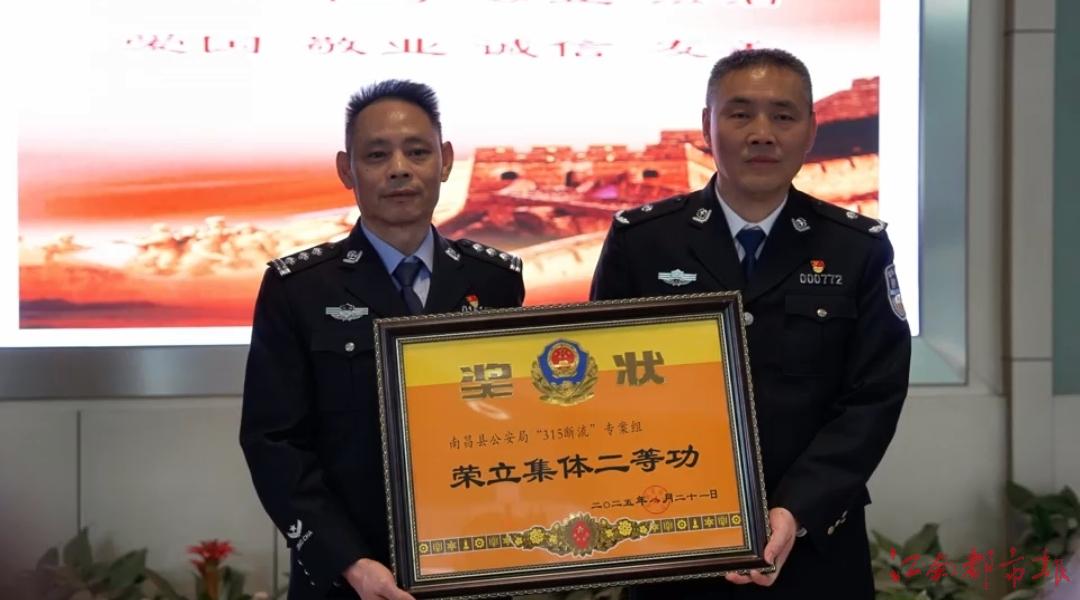 12月16日下午,江西省公安厅组织专人“送奖上门”,为南昌县公安局“3·15”断流专案组颁发“集体二等功”奖状,表彰其在打击治理电信网络诈骗犯罪工作中取得的突出成效。