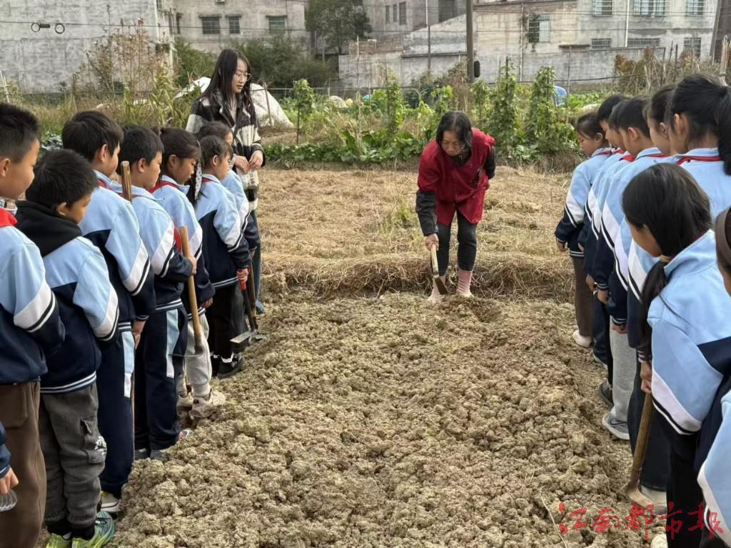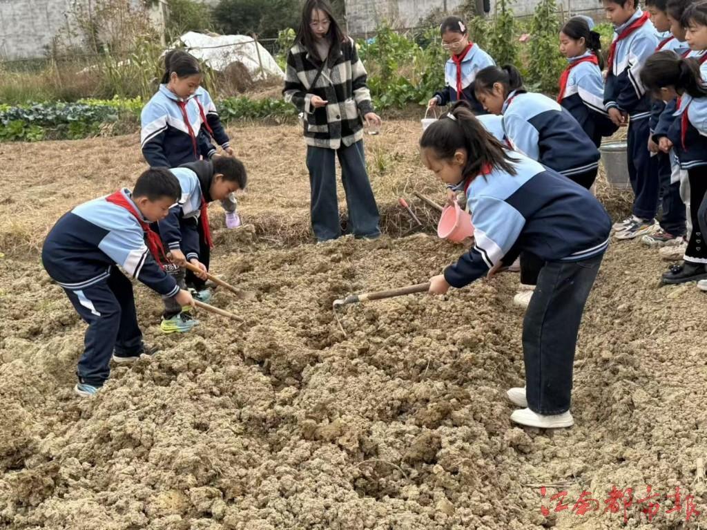 大江新闻讯 彭青芸、江西日报全媒体记者张海光报道:冬日暖阳洒满校园劳动实践基地,泥土与草木的清香萦绕其间。12月5日下午,大余县青龙镇中心小学一场以油菜播种为主题的“一平米思政课堂”温情开讲,身着校服的孩子们围聚田埂边,在翻土、播种、浇水的实操中感悟劳作艰辛,在分享交流中激发感恩之心,让劳动教育与思政教育在田间地头深度融合、落地生根。