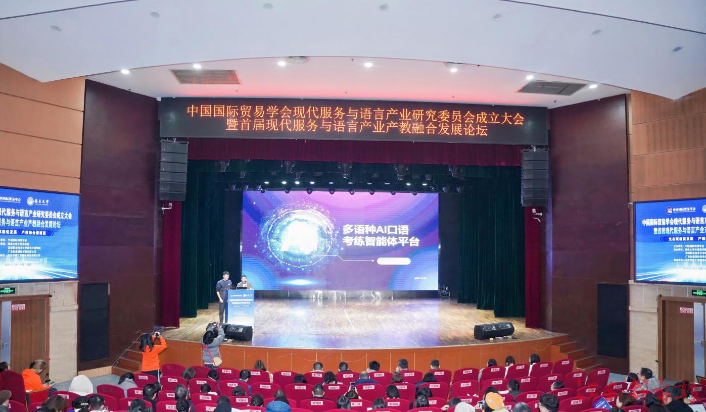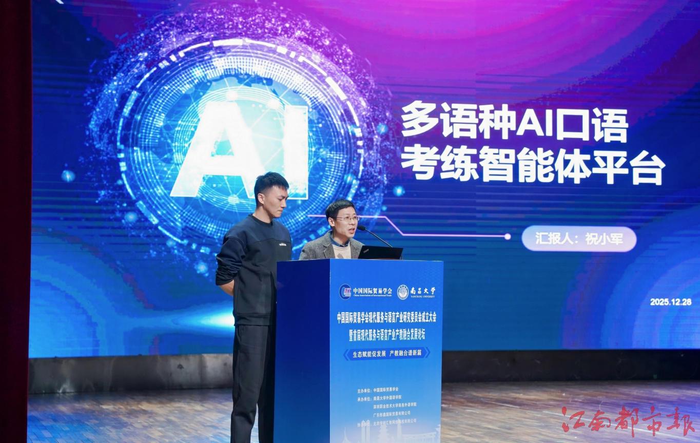 本报讯 贺凯达、全媒体记者皮婉婷摄影报道:12月28日,中国国际贸易学会现代服务与语言产业研究委员会成立大会在南昌大学举行,并同期举办首届现代服务与语言产业产教融合发展论坛。会上发布了“多语种AI口语考练智能体”平台,可创设高仿真情境等,破解学生“没地方说、不敢说、不会说、说不好”的口语学习困境。