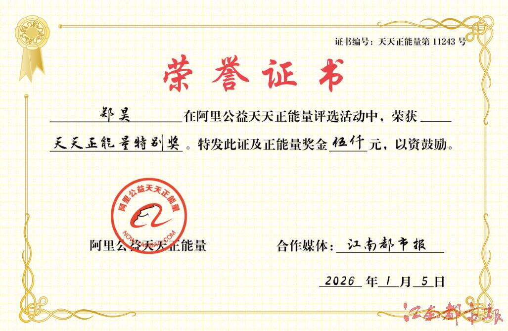 本报联合阿里公益天天正能量,为郑昊颁发正能量特别奖,并奖励其5000元正能量奖金。在给郑昊的颁奖词中,阿里公益天天正能量这样写道:“深夜呼救声起,你三度叩响生命之门。从课堂到现实,听诊器听出的是专业,更是仁心;从邻舍到病房,血氧仪量出的是数据,更是担当。‘这事让我遇上了,我就有责任管到底。’简单话语背后,是医学生誓言的最早践行,也是邻里温情的最深诠释。今天,阿里公益天天正能量联合江南都市报,用一份正能量特别奖,送上感谢与敬意:郑昊,感谢你三次不放心地转身,感谢你在那个深夜选择成为生命的守护者。这不仅是邻里间的温暖相助,更是专业精神与人间善意的美好相遇。”