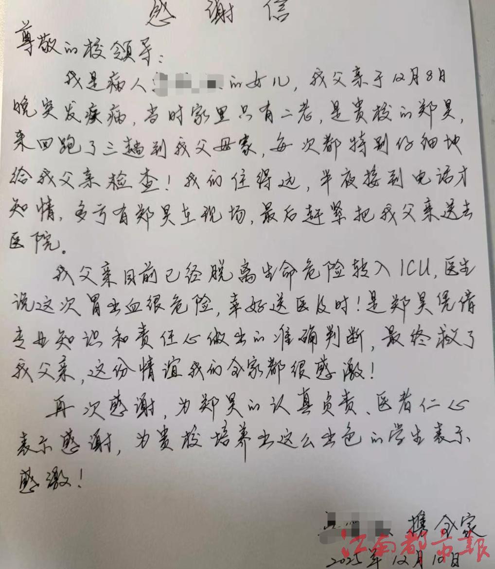 经送医诊断,老人为胃穿孔伴大出血,病情危急。所幸救治及时,老人术后脱险,逐步康复。“是郑昊凭借专业知识和责任心作出的准确判断,最终救了我父亲!”家属感激不已,特地写下感谢信,赞他“认真负责,医者仁心”。