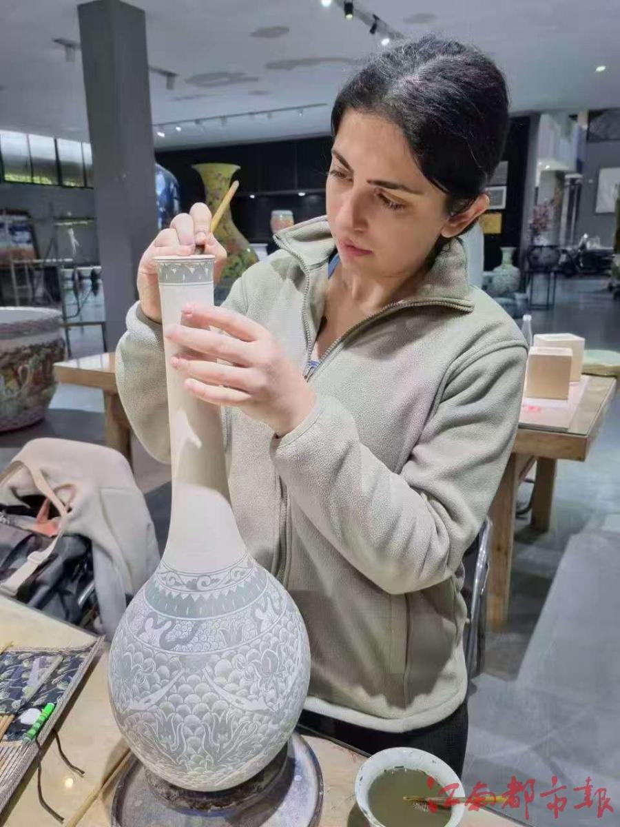 江西省美术馆“丝路回望·瓷上中国——釉色里的敦煌”特展上,展出了土耳其青年艺术家迪兰的作品《友谊的花瓶》