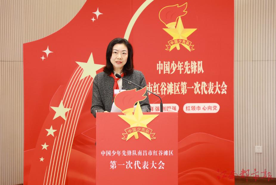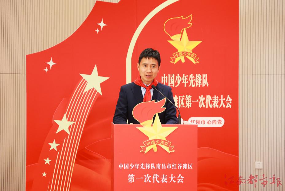 刘众星代表团市委和市少工委向大会的召开表示热烈祝贺。他指出,红谷滩区少工委正式成立、第一次少代会隆重召开,是红谷滩区少先队事业发展史上的重要里程碑,标志着全区少先队工作进入了规范化、系统化、高质量发展的新阶段。刘众星对红谷滩区少先队工作提出希望:少先队员要牢记嘱托,争做全面发展的时代栋梁,眼里要有信仰的光,心中要有强国的梦,脚下要有实干的路;少先队组织要守正创新,激发高质量发展的活力源泉,以改革创新精神推动工作提质增效,让星星火炬在新时代更加闪耀;各级团组织要压实责任,筑牢全团带队的工作根基,将少先队工作纳入总体布局,推动党、团、队一体化育人体系落地见效。